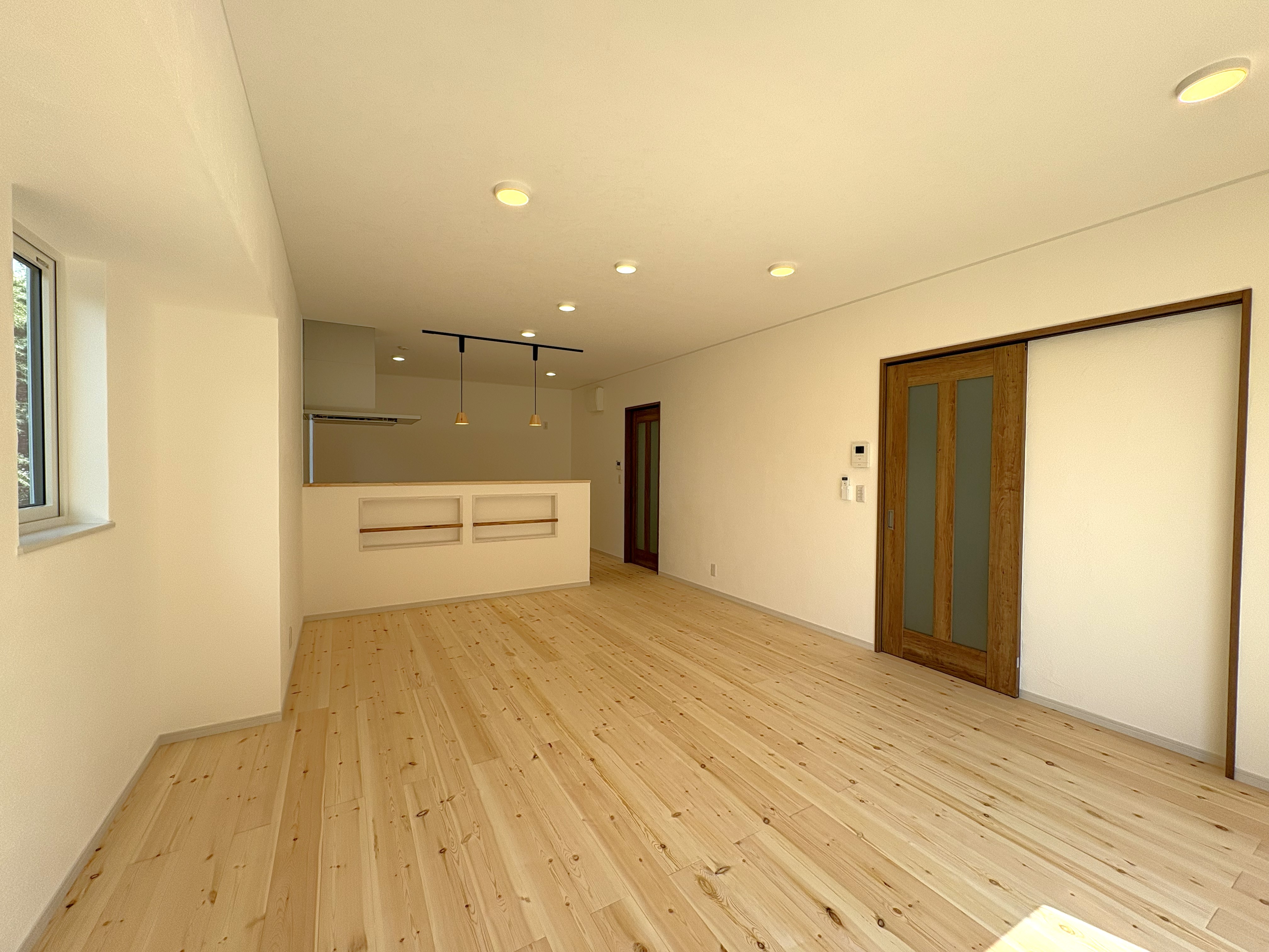 キッチンと居間を仕切っていた壁や引き戸をなくして一つの空間にしました。